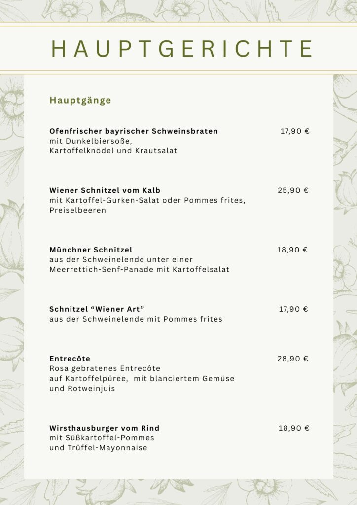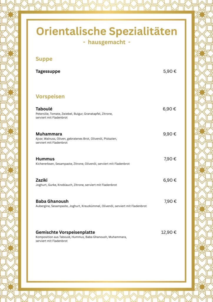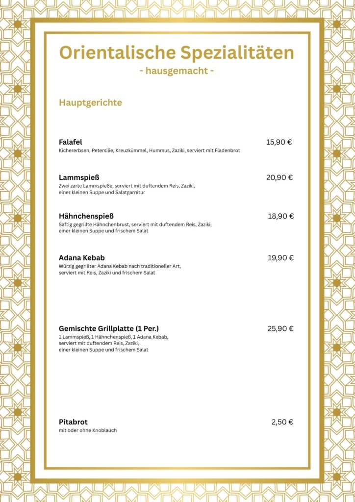 Werfen Sie einen Blick in unsere Speisekarte und lassen Sie sich von unseren hausgemachten orientalischen Spezialitäten sowie bayerischen Klassikern inspirieren.